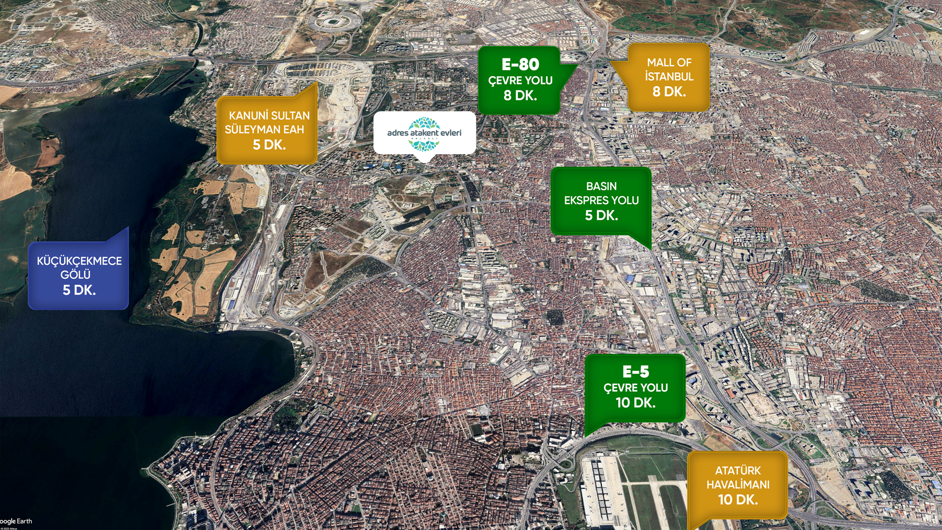 Adres Atakent Konutları projesi Atakent’te, bölgesinde en ulaşılabilir projesi olarak bilinen Adres Atakent Konutları, Basın Ekspres’in yanı başında TEM Otoyolu’na birkaç dakikalık mesafede.