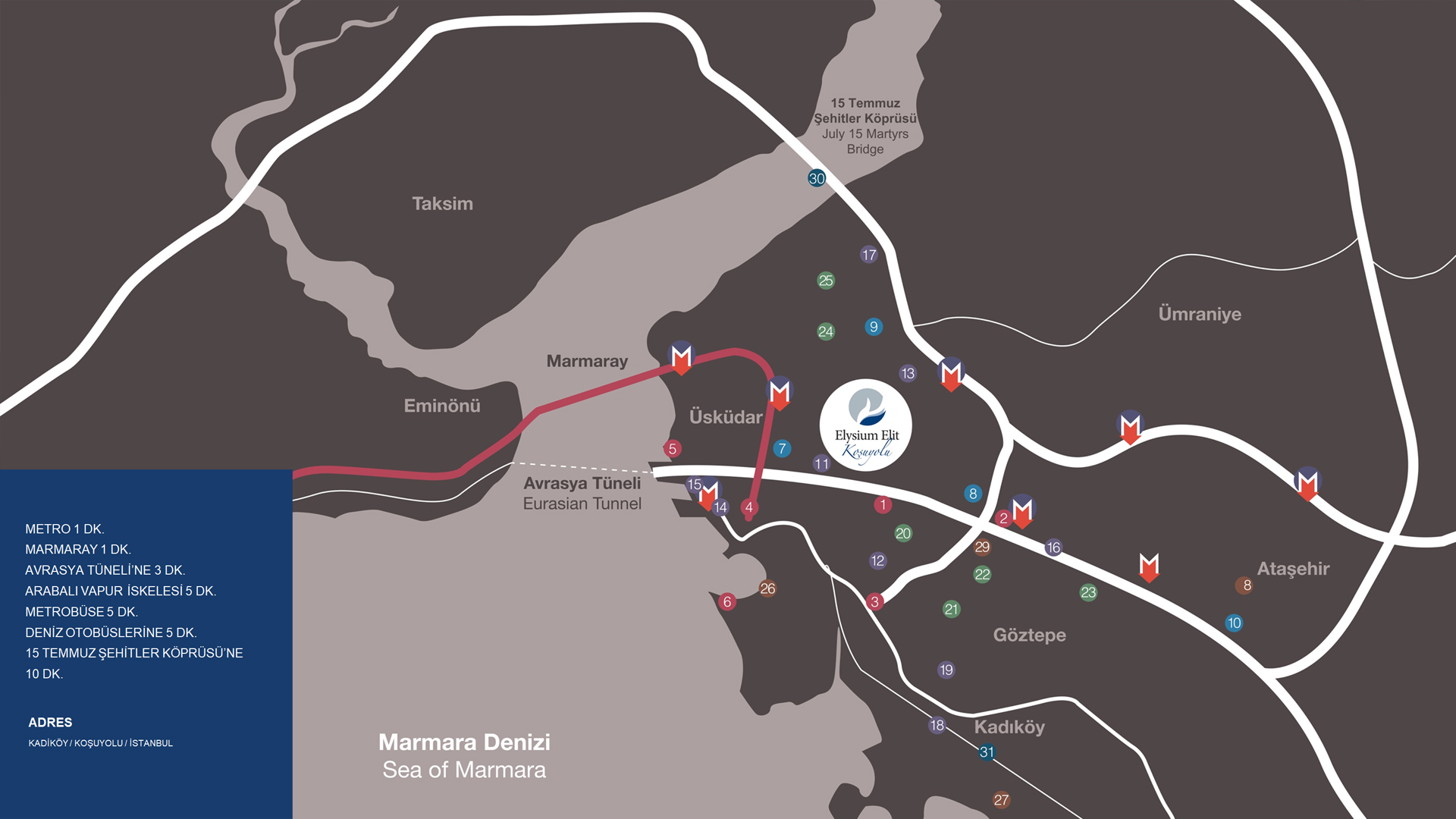 Elysium Elite is situated in Koşuyolu, one of the most beautiful neighborhoods of Istanbul, spanning across 10,000 m² with 2 blocks. Designed by Çamoğlu Architecture, the interior design of the project is credited to the renowned architect Melike Battal.